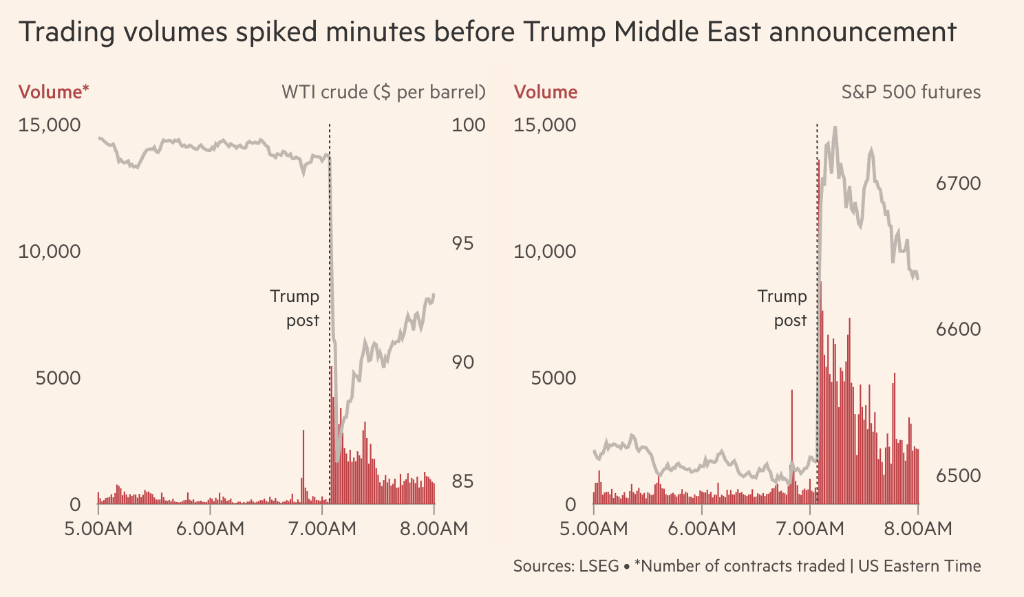 • Traders Placed $580mn in Oil Bets Ahead of Donald Trump’s Social Media Post on Iran Talks: Someone placed enormous oil bets right before Trump’s Iran post moved the market. Coincidence is one explanation, but not the most obvious one. (Financial Times)