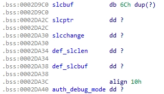 Here you can see the slcbuf variable, which we can overflow, and a handful of variables following it (there are more not shown above – rest assured, they are irrelevant for our purposes). There’s slcptr – a pointer into the slcbuf – and then slcchange, a relatively boring boolean. After a length variable, there’s an innocent-looking variable named def_slcbuf. Let’s take a look at the source and see what this variable does.