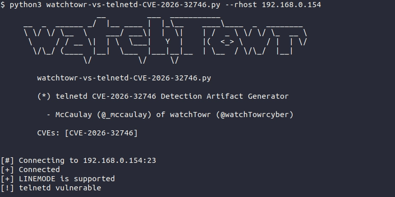 $ python3 watchTowr-vs-Telnetd-CVE-2026-32746-leak.py --rhost 192.168.0.154