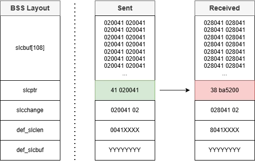 You can see here that we’ve sent a large SLC table, enough to just slightly overflow the target buffer. Note, however, that something unexpected has happened – rather than the SLC table we expect to see returned, we see lots of random-looking bytes returned. That’s not even what we sent! What’s gone on here?!