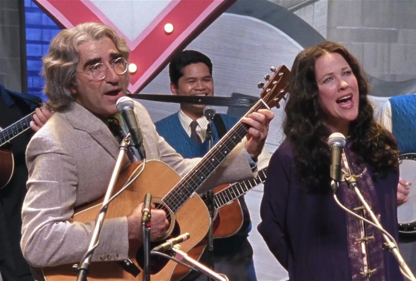 O’Hara and Levy are a perfect pairing, bouncing “yes ands” off each other like the comic professionals and old friends they are. Their rapport is no secret, given that the two spent years performing alongside one another on the Canadian sketch show “SCTV” before continuing their collaboration in Guest’s films, and later in “Schitt’s Creek.” And though Mitch and Mickey fall into the duo’s typical husband-and-wife dynamic, Levy and O’Hara are also subtly commenting on their years of experience creating together and how chemistry evolves when an artistic relationship turns into a real friendship. As “A Mighty Wind” progresses, what Mitch and Mickey’s relationship will look like after the concert ends becomes the film’s binding question, made all the more pressing by the inevitable concert rendition of their hit song, “A Kiss at the End of the Rainbow.” In every live performance during their heyday, the pair ended the song by leaning in for a kiss, making audiences go wild. “We were easy to love because, in a way, we represented true love and romance,” Mickey says.