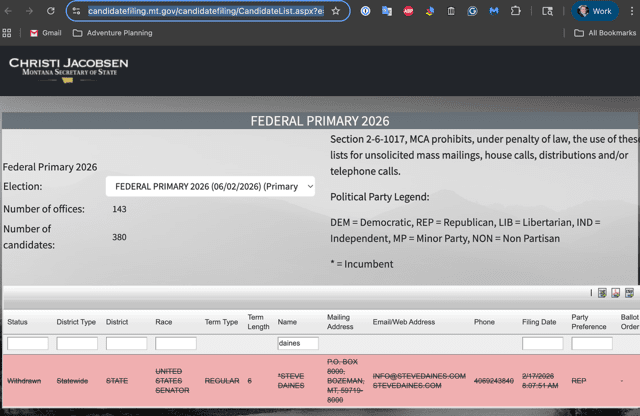A screenshot of the secretary of state’s official candidate list, with Daines’ crossed out name, appearing in red with the word “withdrawn,” was circulating widely on social media Wednesday evening.