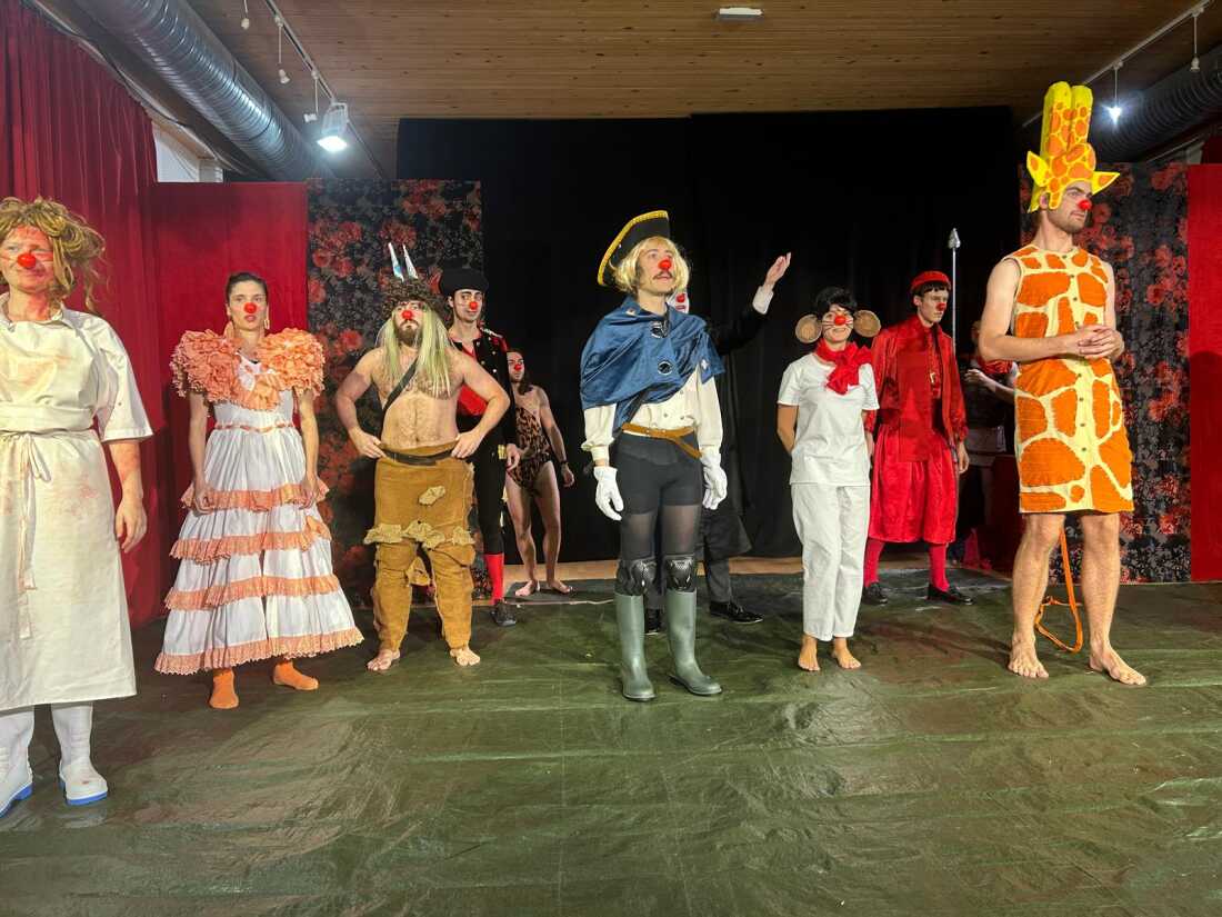 Members of the Stamptown ensemble perform at the Fringe festival in Edinburgh, Scotland, in August 2025. The show’s ringmaster is Zach Zucker, an alum of France’s École Philippe Gaulier.