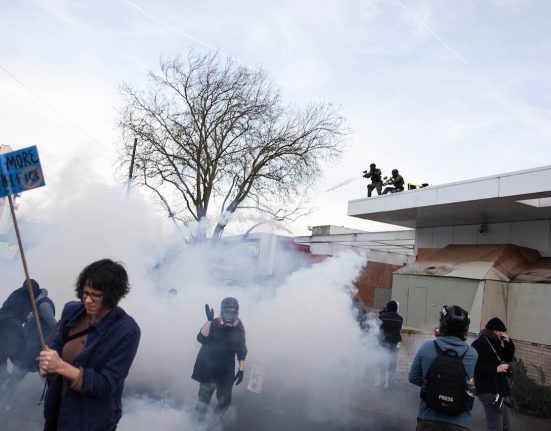 Federal officers at Portland’s U.S. Immigration and Customs Enforcement facility fired a tear gas canister that shattered the window of a nearby apartment.
