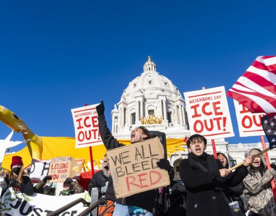 Students cheer during a school walkout to protest federal immigration enforcement at the State Capitol building on January 14, 2026, in St. Paul,.