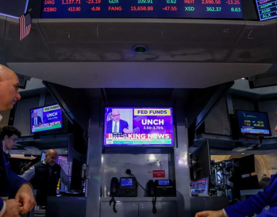 A television station broadcasts the Federal Reserve’s decision to hold rates after a Federal Open Market Committee (FOMC) meeting on the floor of.