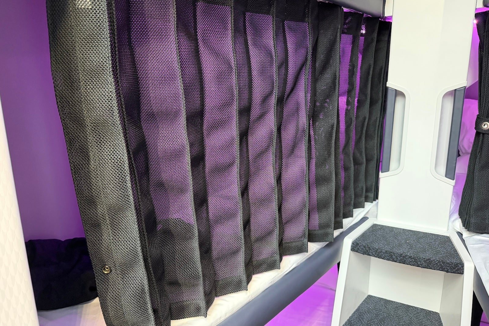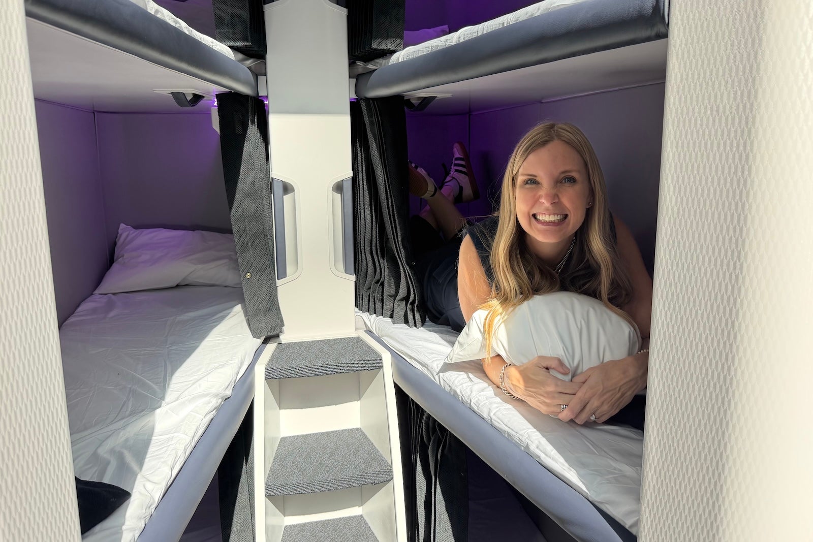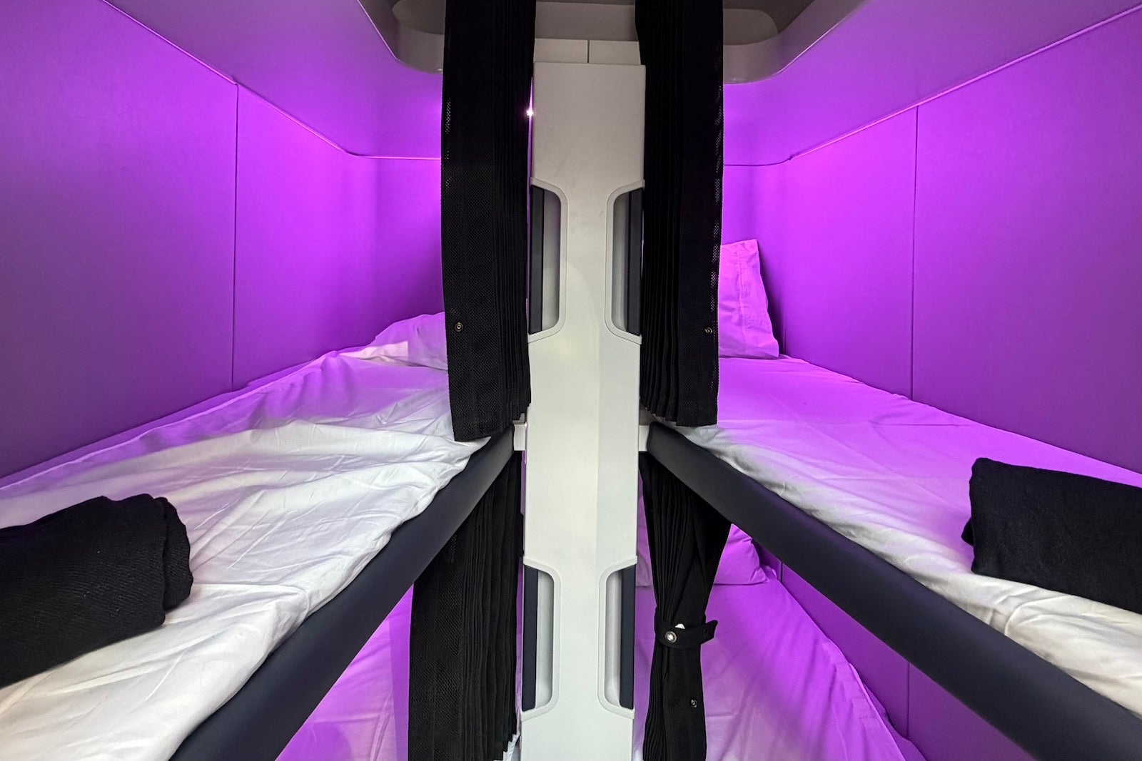 I am 5 feet, 7 inches and fit very comfortably, though a man at the media preview was 6 feet, 4 inches and was also able to fully stretch out, albeit with a much tighter fit. The airline shares that the bunks are 6 feet, 6 inches long, which should allow most passengers to lie all the way flat. There are also about 25 inches of width at the shoulders, though the space does taper as it reaches where your feet traditionally go.