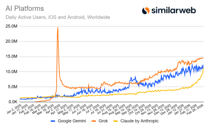 On that front, another market intelligence provider, Similarweb, found that Claude’s app on iOS and Android devices saw 11.3 million daily active users on March 2, up 183% from the start of the year when usage was around 4 million, and up from 5 million daily active users at the beginning of February.