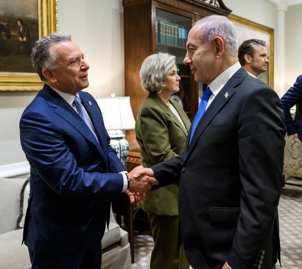 Steve Witkoff, U.S. Special Envoy to the Middle East, at left, shakes hands with Israeli Prime Minister Benjamin Netanyahu at the White House in 2025. White House