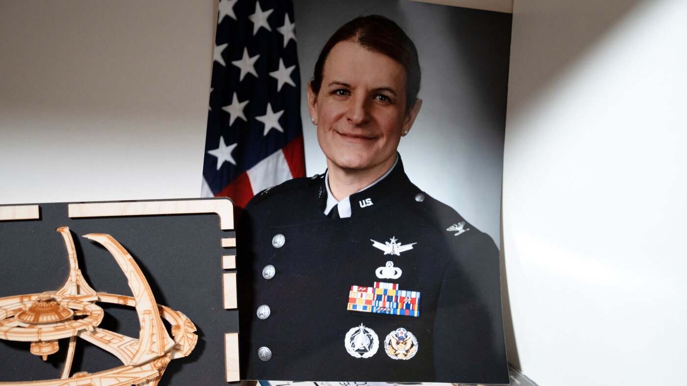 A portrait of retired Col. Bree Fram sits among other memorabilia at her home in northern Virginia. Fram, a former Space Force officer and Air Force veteran, was once the highest-ranking transgender member of the U.S. military.