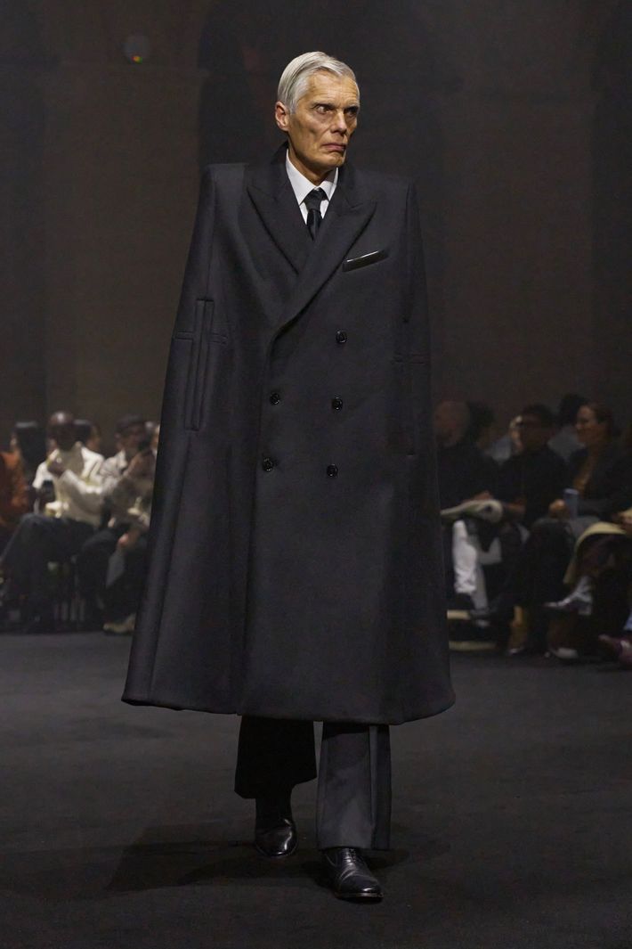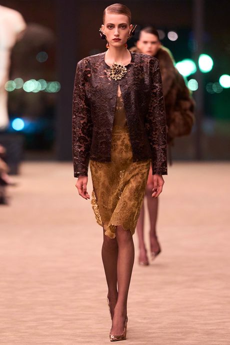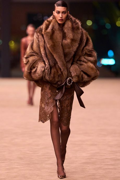 That evening, Anthony Vaccarello reprised the Saint Laurent tuxedo in a wood-paneled room straight out of a power broker’s movie office, The Fountainhead, or Succession. Vaccarello likes a concise message, and he added lavish shearlings and lace coated in silicone to give it body. “It’s a house where you always have an image in your head,” Vaccarello said. That image, of course, is Helmut Newton’s 1975 photograph of two women, one as naked as a mannequin, the other looking androgynous in a tux, in a dark Paris street.