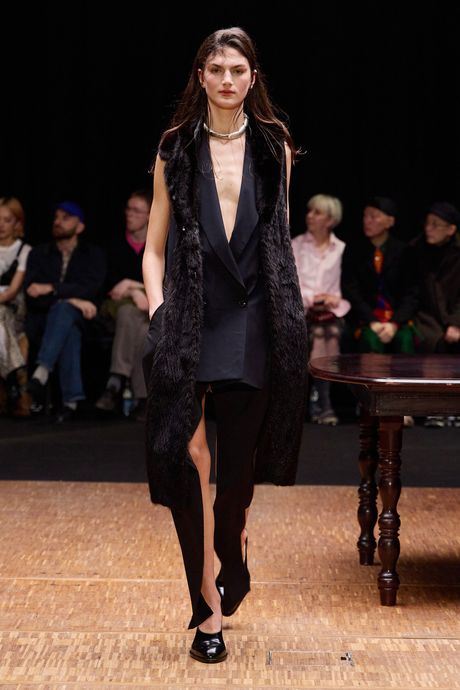 In their program notes, Hannah Rose Dalton and Steven Raj Bhaskaran said, “We ‘Fecalized’ the New Look by injecting our distorted vision of glamour.” That’s a good summation of Matières Fécales, which played on a theme, appropriately, of power and the one percent. The brilliant, creepy casting drew on the old-old rich, with a top-hatted gent who looked like the Monopoly game guy, and, as well, the bald acolytes who make up the Fecal Matter cult. Well, fashion is strange, and it has been strange for centuries. Though the bombastic designs often recall the early work of Galliano and some McQueen and Demna, in the druid hoodies, they’re well-crafted, in particular a silver-feathered gown. And Dalton and Bhaskaran keep advancing their weirdness.