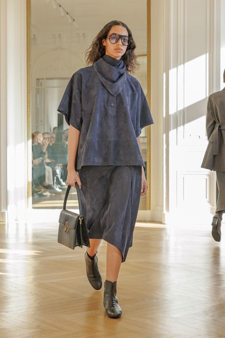 And Stephanie Danan put on a good show for Co, a brand she co-founded about 15 years ago in Los Angeles, which is now designed in Paris. In monochromatic shades of gray, navy (for a lovely popover top in suede with a matching easy skirt) and putty beige, she offered a crisp silhouette without heaviness. Contrived she is not. More people should know about Co, in part for its quality and in part for its decent prices.