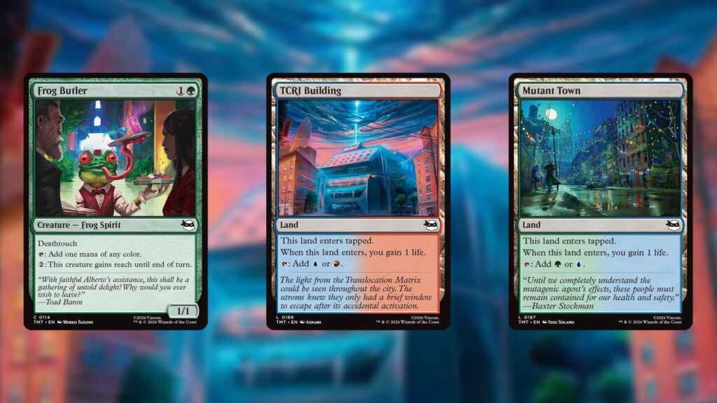 While a multicolored tapland cycle is a very traditional theme in draft formats, its win rates rarely merit notice. That said, this time around, three of the highest win rate commons in the set are just mana fixing. Frog Butler and TCRI Building are the two best commons in the set, and Mutant Town is tied for the top six. Everything Pizza also has a 60%+ win rate, despite cards like Everything Pizza typically having a sub-50% win rate in most Limited formats.