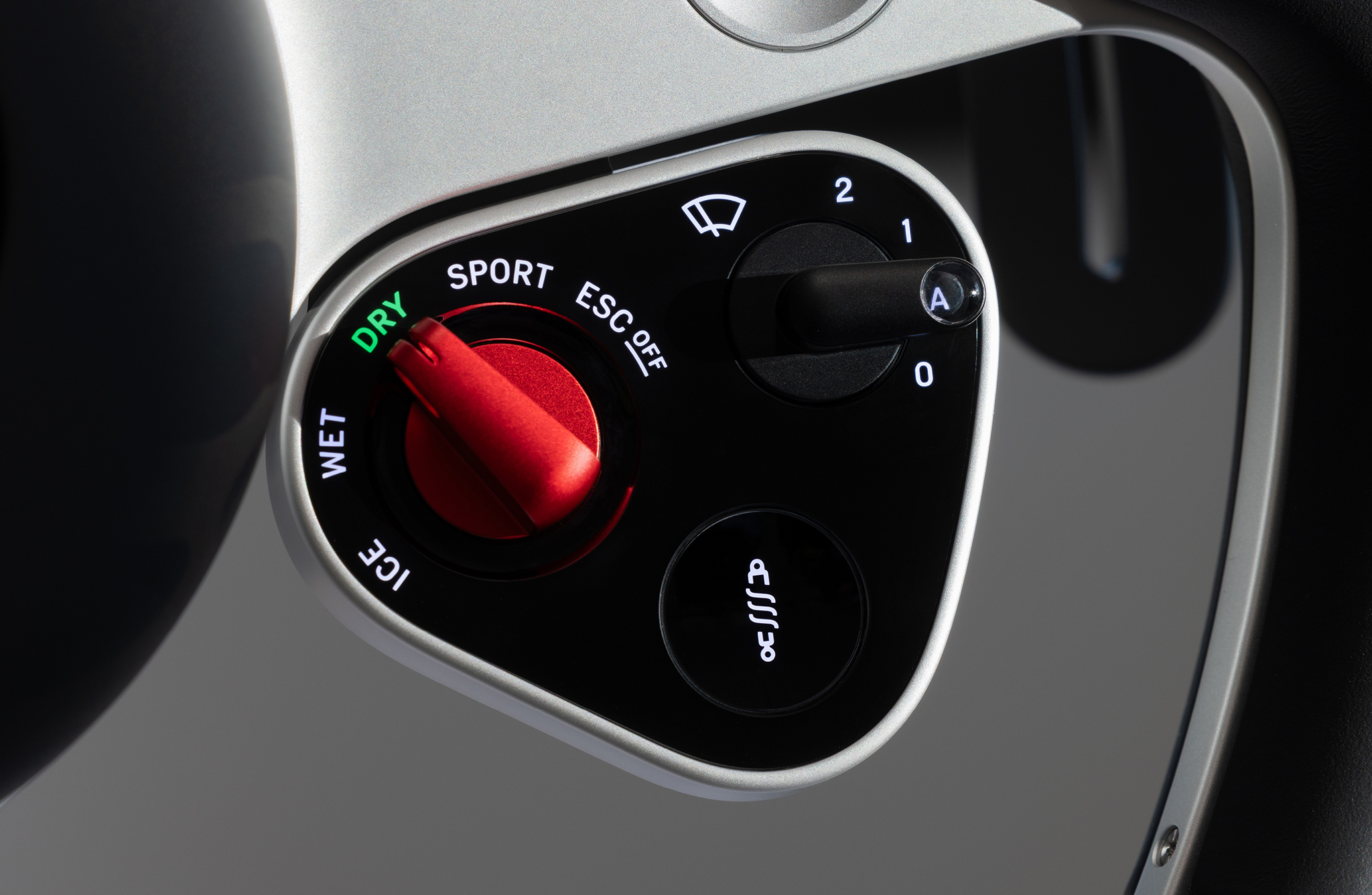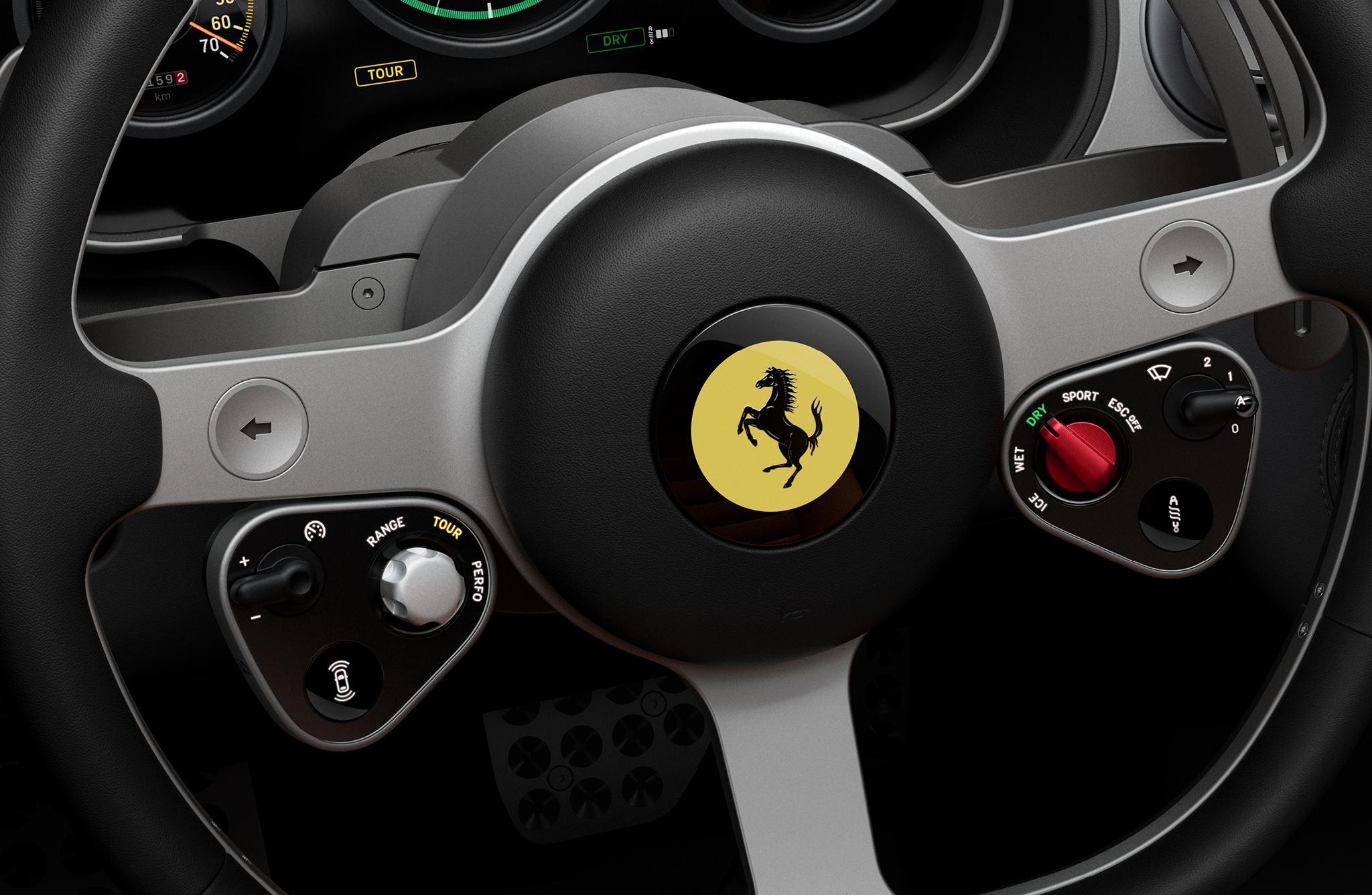 Underneath those are two control pods flanking the hub with more physical buttons and toggles—the left houses the cruise control and powertrain settings, and the right one has the familiar Manettino drive mode dial, windshield wiper lever with a little glass magnifier showing the selected setting, and suspension mode button.