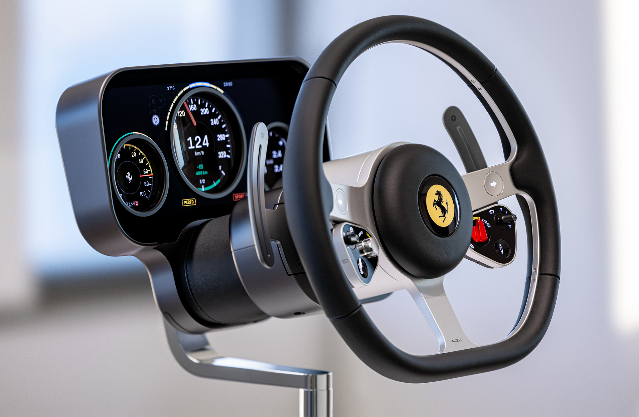 Two large column-mounted paddle shifters sit directly behind it, which will be used to change the Luce’s Torque Shift Engagement system. Ferrari really doesn’t want to call it fake shifts, instead focusing on how grabbing a paddle will change the car’s entire torque curve, but functionally, it’s going to be fake shifting.