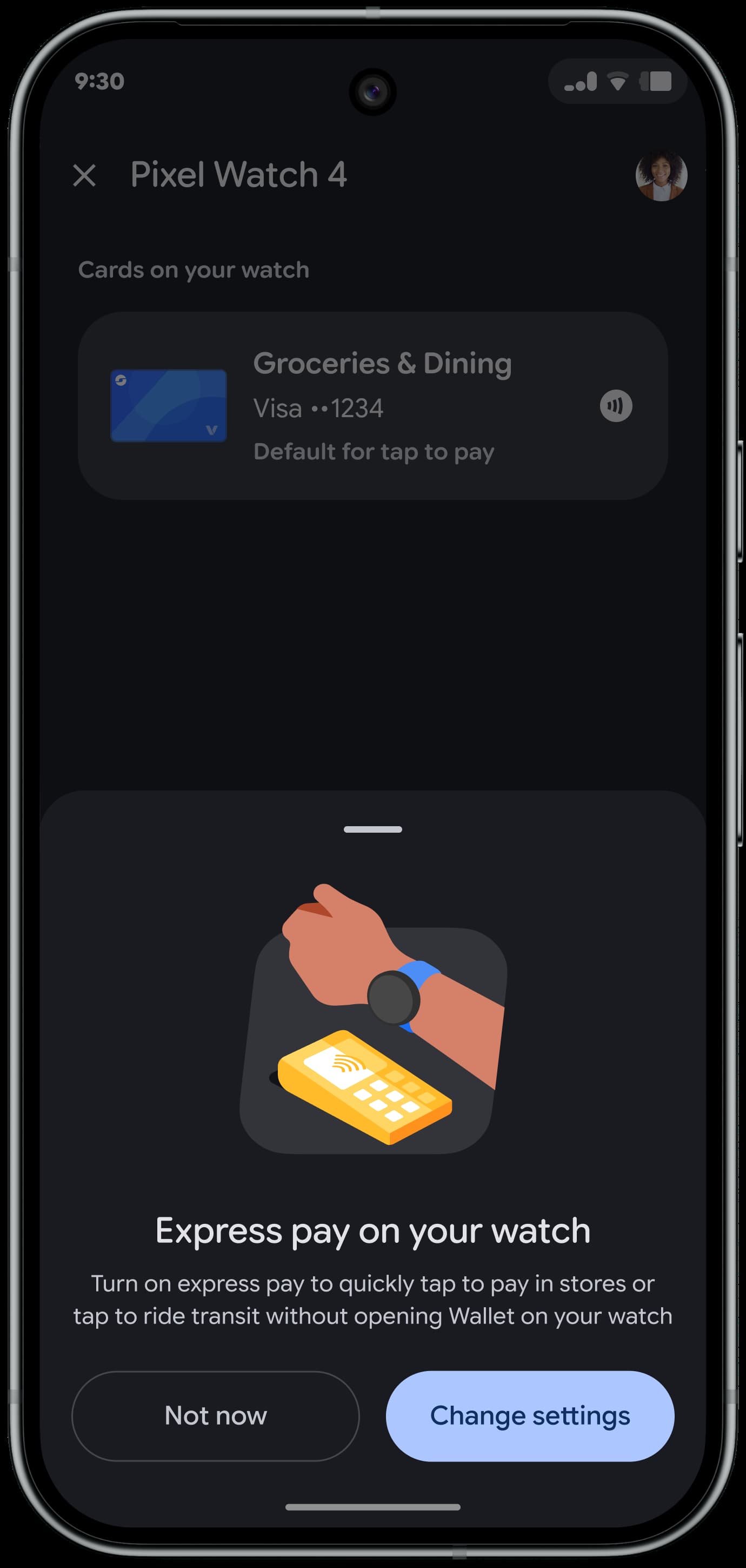 Express Pay will let you make NFC payments without having to first open the Google Wallet app. You can have this work for “Tap to pay and transit” or just “Transit only.” Just turn and tap your Pixel Watch 2+ to a retail terminal.