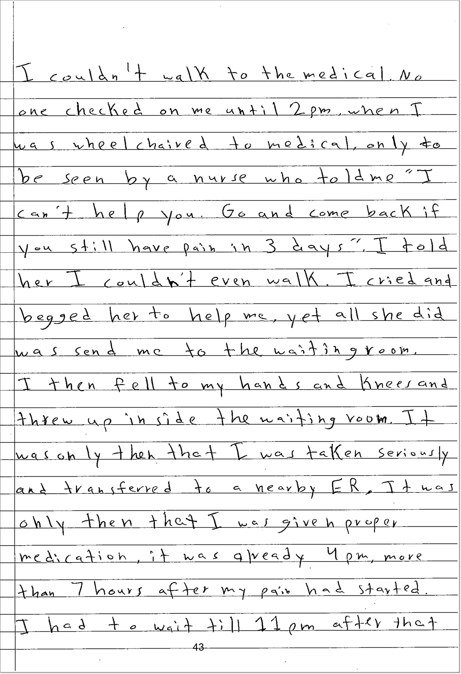 The 16-year-old son, who described suffering from appendicitis, wrote that he began feeling “severe abdominal pain” one morning and was unable to walk to the medical unit. Hours later, he was brought in a wheel chair to see a nurse who he said told him, “‘I can’t help you. Go and come back if you still have pain in 3 days.’”