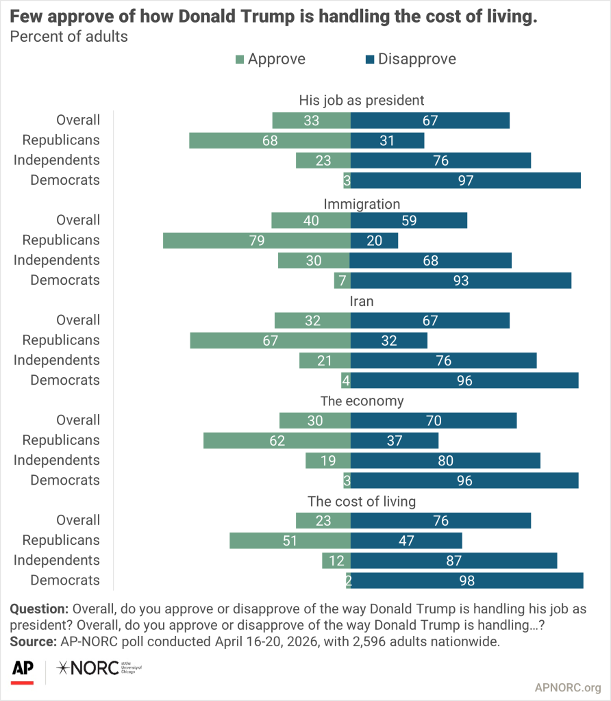 Just 23% approve of how he is handling the cost of living, while 76% disapprove. At the same time, a growing number of Americans say the U.S. economy is not doing well: 73% now describe the economy as poor, up from 66% in February.