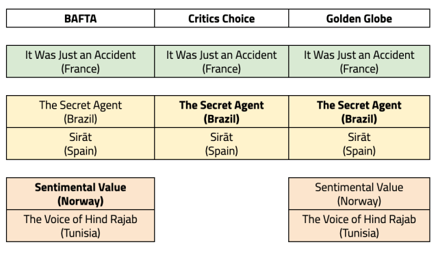 | 1. Norway, Sentimental Value (NEON) | BAFTA, GG |