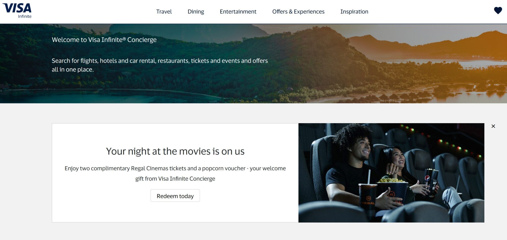 Doctor of Credit has uncovered a cool little freebie for Visa Infinite cardholders: it is possible to register for Visa Infinite concierge and claim 2 free Regal Movie tickets & popcorn. With a number of popular Visa Infinite cards on the market, this is an offer that many readers can probably claim, but I’d bet that this runs out sooner rather than later.