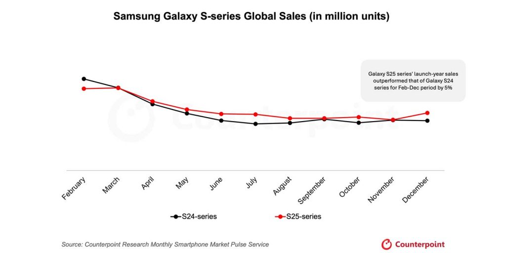 It looks like the Galaxy S25 Ultra had a slightly better mid-year average, while the end of the year shows some similar numbers between the two. It’s also worth noting that the Galaxy S25 series as a whole outperformed the S24 series, with sales up 5%.