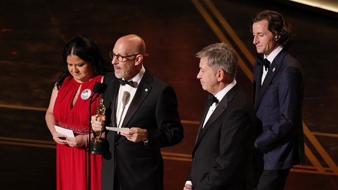 HOLLYWOOD, CALIFORNIA – MARCH 15: (L-R) Gloria Cazares, Joshua Seftel, Steve Hartman, and Conall Jones accept the Documentary Short Film award for “All the Empty Rooms” onstage during the 98th Oscars at Dolby Theatre on March 15, 2026 in Hollywood, California. (Photo by Kevin Winter/Getty Images)