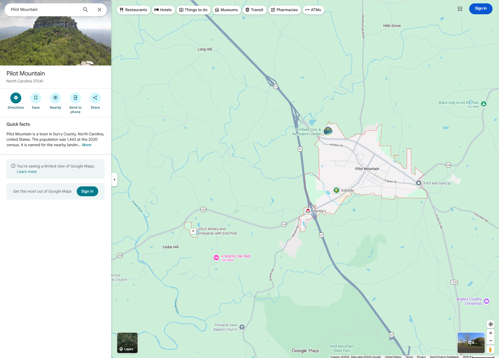 Looking at a State Park in NC, the signed-in version of Maps shows nearby hotels, rentals, and user photos, as well as some facts about the area. The signed-out version shows almost none of this, and even removes a bunch of nearby businesses and attractions from the map itself.