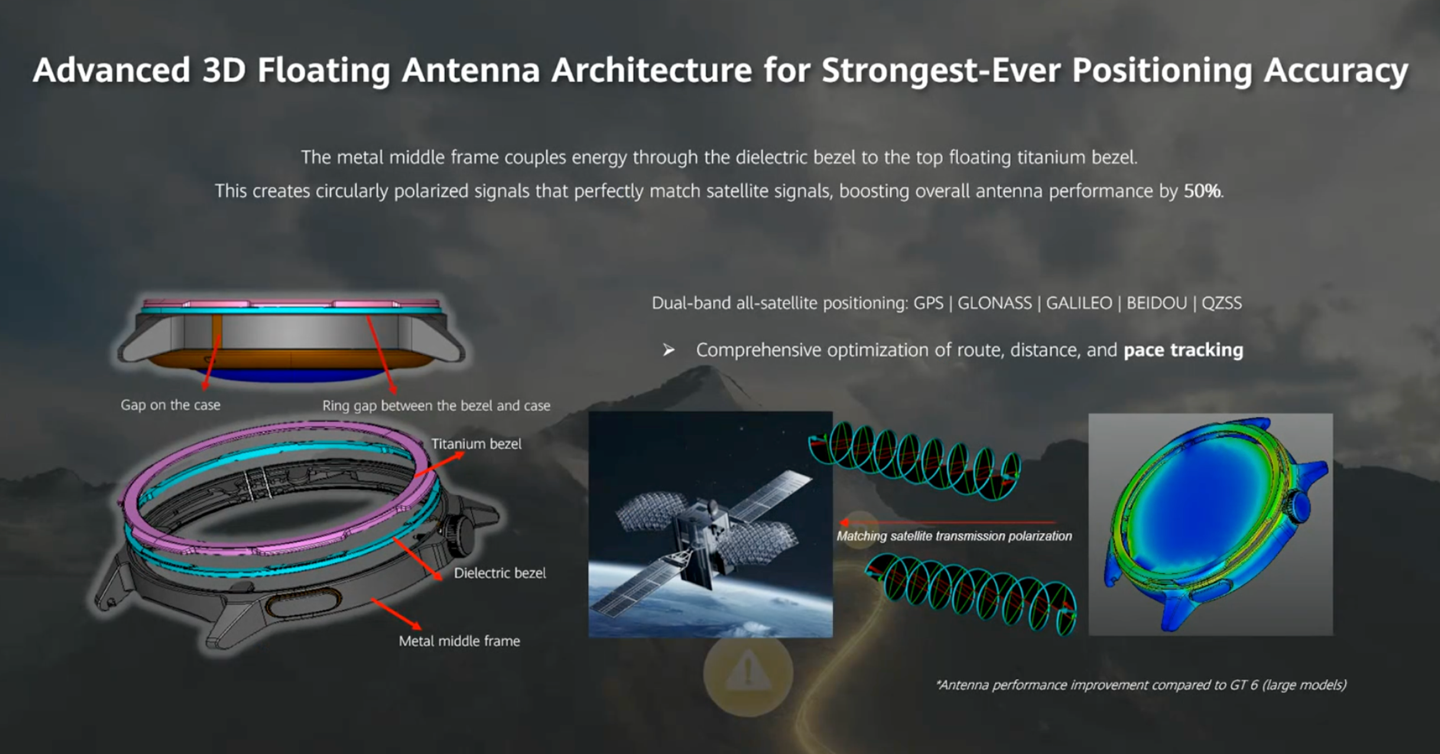 So with that backstory, let’s talk about what Huawei is doing. Below is a slide from their presentation. Essentially, they have not one, but *two* GNSS antennas here. The first antenna is built into the case itself, whereas the second antenna is built into the titanium bezel. That aqua-colored ring is an isolation ring that keeps the upper antenna floating there, ungrounded (whereas the lower antenna is grounded).