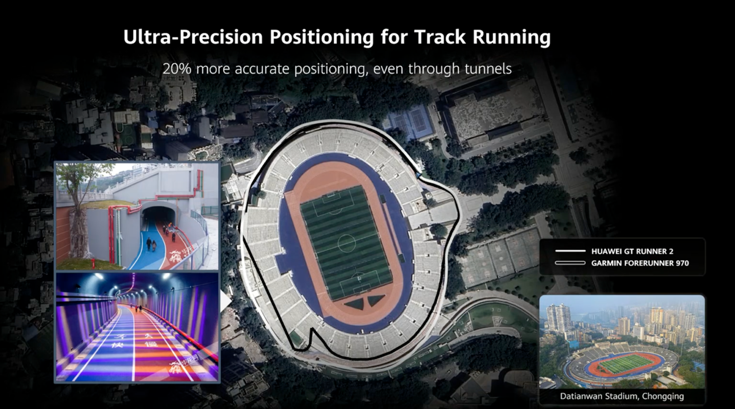 And another, more interesting one, talking about how they were combining this with algorithms to figure out where you’re going, even when no GPS exists. They do this by blending GPS data with mapping data. In the case below, the title says “Track Running”, but you can see it’s actually the outside perimeter of the track, where it goes under a stadium in a very neat-looking tunnel. Here, because the Huawei watch has the actual running path details, it locks onto that once it loses GPS signal. It’s a creative solution, and something we’ve seen Apple dabble with a bit over the last few years (though, not quite to this level).