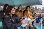 Viola DeVigal, an organizer and leader of the demonstration, left, sings protest songs with Leone Cook, center, and others at a rally of mostly high school students who walked out of class or didn’t attend as part of a general strike in protest of recent U.S. immigration policies, violence and killings, at Glenhaven Park in Portland Ore., on Jan. 30, 2026.