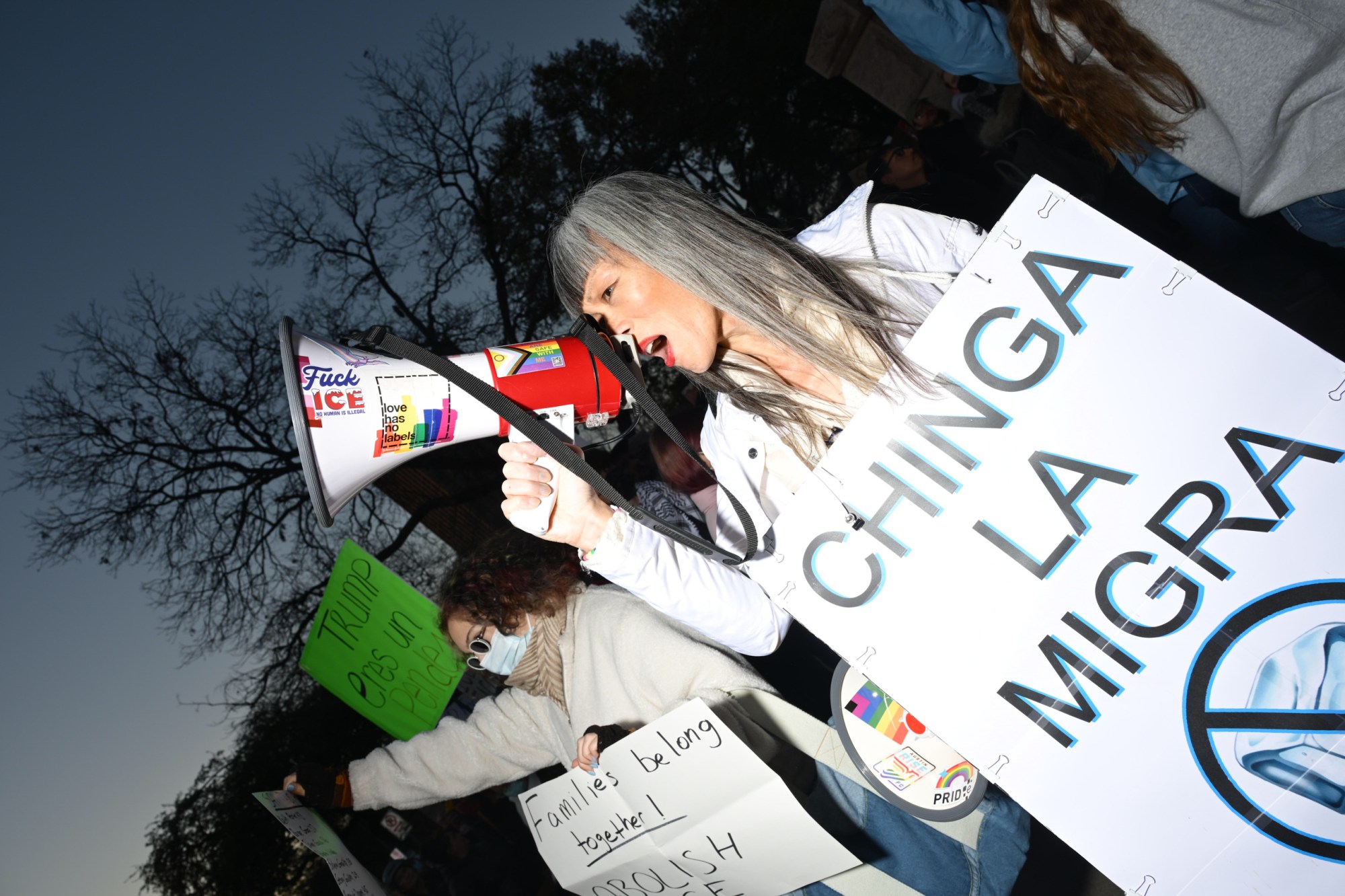 UT Austin professor Zenzi Griffin joined protesters at the Capitol with a sign describing ICE as “new slave patrols” and called the Trump administration’s immigration policy the most pressing issue amid “so many horrible things.”