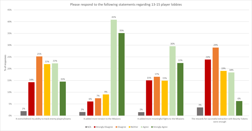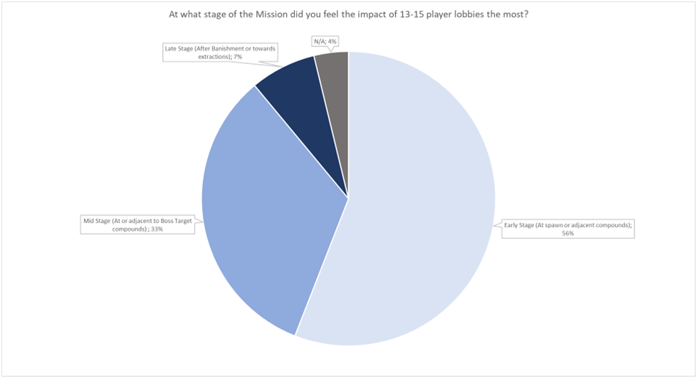 Around 56% of responses indicated that the early stage of the Mission was where the impact of the increased lobby size was most felt. This sharp increase in early engagements was particularly harsh on newer or lower-skilled players. Even if a skilled or lucky player survived these prolonged opening fights, they often ended up on the “wrong” side of the map relative to the Boss Target compound. This understandably led to more demands for retaining double Boss Target Missions in larger lobbies, to spread out fights and make the experience feel less like a “team deathmatch” or “Bounty Clash with extra steps.”