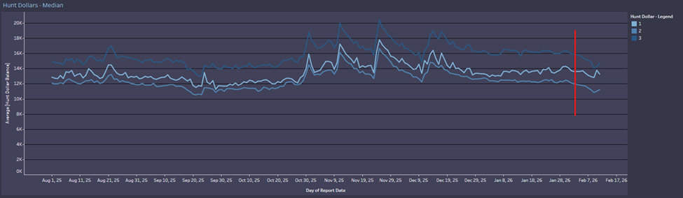 From the graph above, we can see that only 24% of players felt satisfied with the current rewards for successfully extracting with a Bounty Token. With deaths occurring more frequently during the opening minutes of the Mission, we also observed a drop in the average Hunter Dollar balance, with Trios experiencing the largest losses.