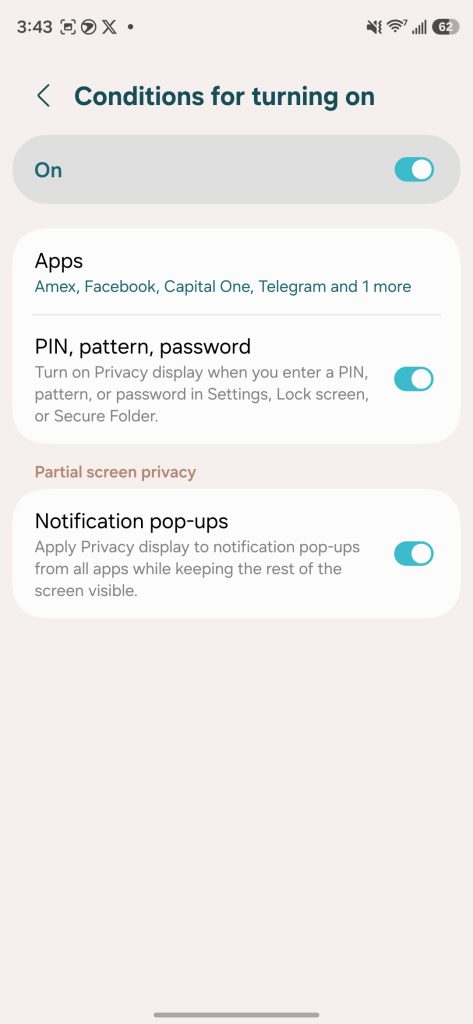 For instance, I have the Privacy Display set to turn on when I’m using messaging apps like Telegram, financial apps, or even social media apps. It’s nice to be able to open whatever I want on my phone and, without thinking about it, know that what I’m seeing is private to those peering over my shoulder when it matters. After a long weekend of travelling, I quickly learned just how invaluable this would be. The cherry on top of the implementation is that Samsung also allows the Privacy Display to be activated solely for notification pop-ups, which is wonderful. The scenarios in which this is useful are endless, but examples can include simply not wanting someone to read your incoming messages if you’re in a public setting. It’s nice to have that peace of mind.