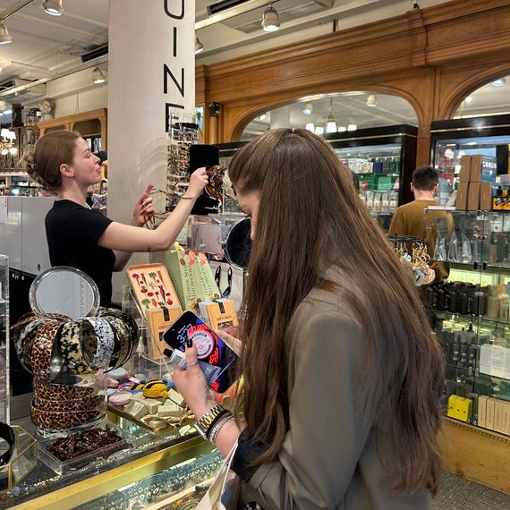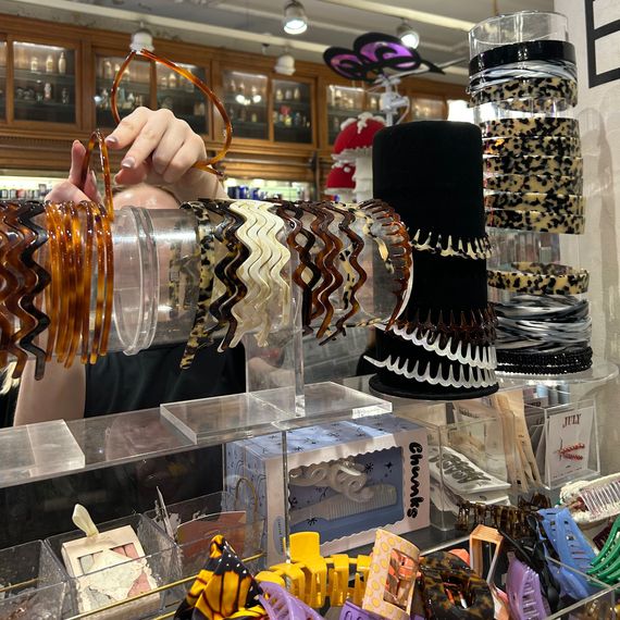 On my way to C.O. Bigelow, I spotted a girl in a cream-colored claw clip and a pair of “Carolyn” sunglasses from Selima Optique. The lack of a line snaking out the front made me hopeful that the inside might be similarly empty. I was, unfortunately, wrong: For 3 p.m. on a Wednesday, it was packed. Dozens of teen girls and young women in their 20s (and one token boyfriend) were clumped into groups, trying on plastic headbands, some with piles of them in different colors sitting on the countertops, and twisting and throwing one another’s hair into loose chignons with French pins and barrettes. “We are such girls!” one said to her friend. They were all gathered around the front counter, where hundreds upon hundreds of plastic hair accessories — clips, claws, combs — in neutrals, pastels, and wacky patterns were set inside of glass cases like untouched pastries.