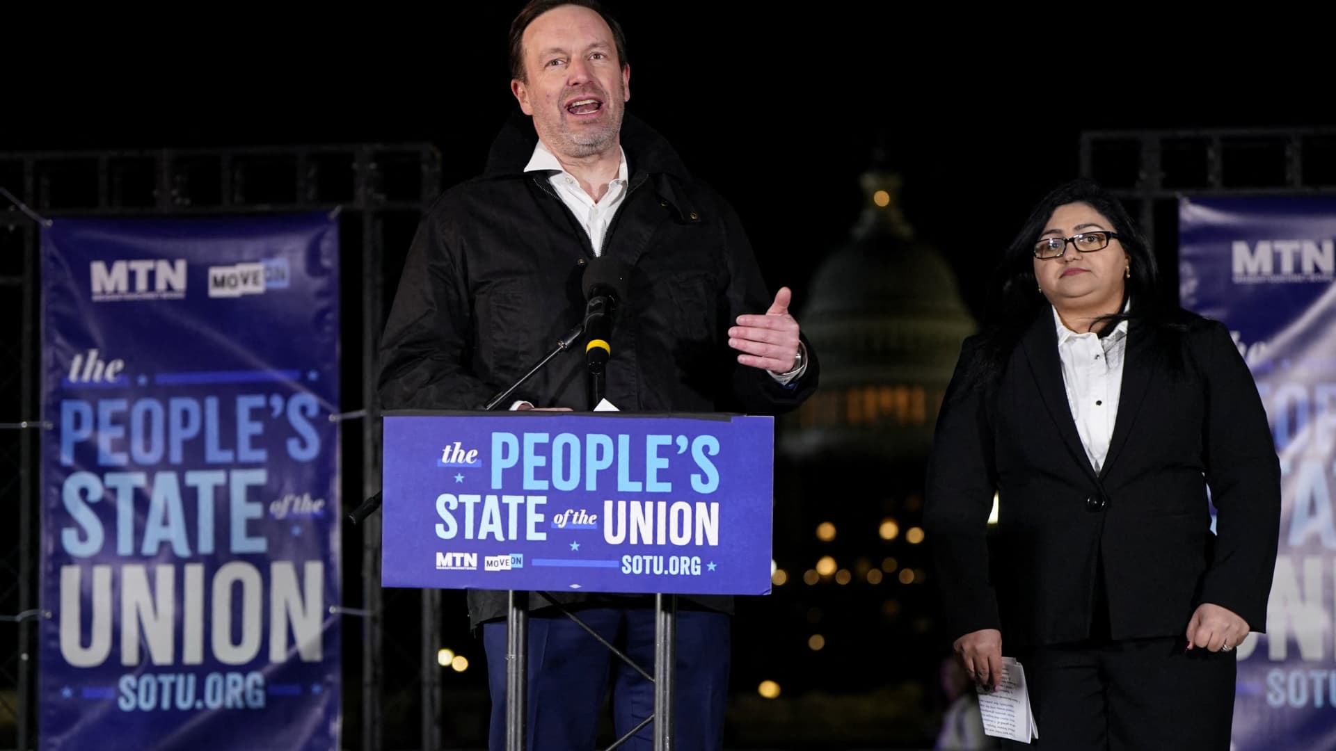 Sen. Chris Murphy, D–Conn., speaks next to his guest Fereshteh Ganjavi, an Afghan refugee and founder of Elena’s Light, during the “People’s State of the Union” event ahead President Trump’s State of the Union address in Washington, Feb. 24, 2026.