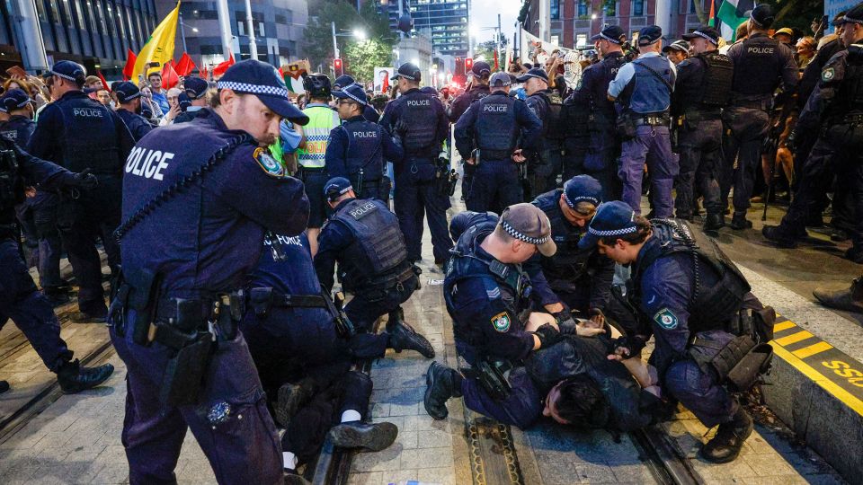 The largest was held outside Sydney Town Hall, where police clashed with thousands of pro-Palestinian protesters on Monday evening, using pepper spray to disperse the crowd and making a number of arrests.