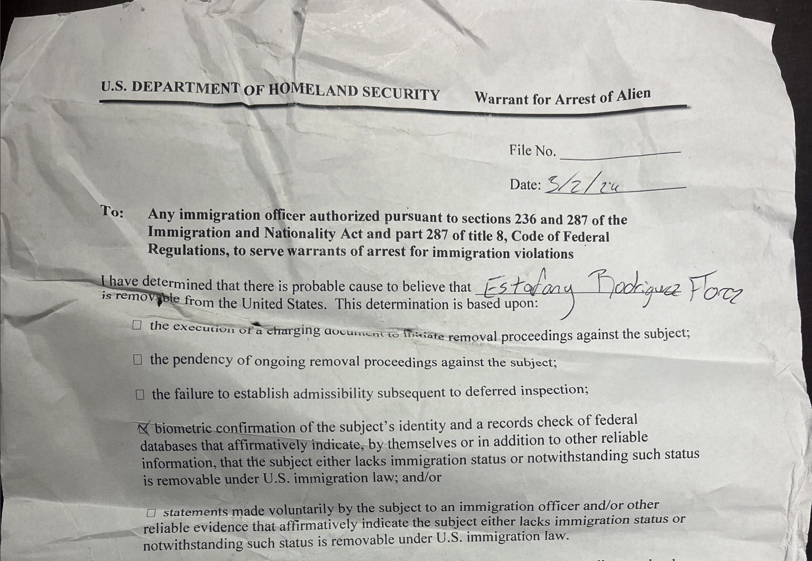 In their noon filing, ICE’s lawyers disputed Rodríguez’s claim that she was taken into custody without a warrant. To support their claim, attorneys attached what appears to be an iPhone photo of a crumpled-up warrant dated March 2, with no file number and the Certificate of Service section left blank.