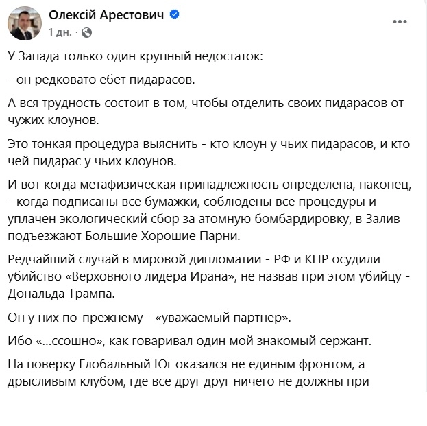 “A rare case in world diplomacy – the Russian Federation and the PRC condemned the killing of the ‘Supreme Leader of Iran’ without naming the killer – Donald Trump,” Arestovych noted.