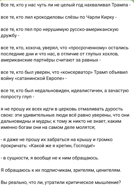“All those who for a whole year praised Trump, shed crocodile tears over Charlie Kirk, sang songs about unbreakable American-Russian friendship, all those who said Zelensky had only days left, and that unlike the Ukrainians the Americans speak to us as equals – have you completely lost your capacity for critical thinking?” Prilepin sneered.