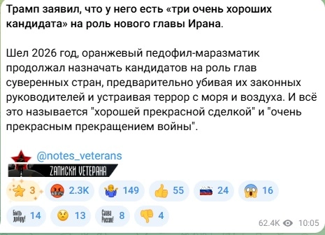 “It was the year 2026, and the orange pedophile senile man continues to search for candidates for the role of heads of sovereign countries, first killing their legitimate leaders and calling it a ‘beautiful deal!’” wrote the popular propaganda Telegram channel with a million subscribers, Notes of a Veteran.