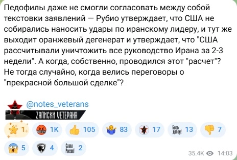 “The pedophiles couldn’t even coordinate their statements with each other! Rubio claims that the US did not plan to strike the Iranian leader, and immediately the red-haired degenerate comes out and declares that the US planned to destroy the entire top leadership of Iran within 2–3 weeks,” the channel wrote.