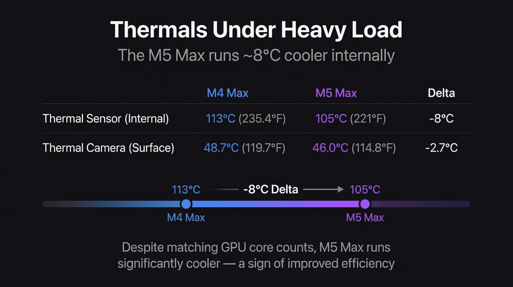 Now, keep in mind that the new ‘performance’ cores are running at a higher frequency than the M4 Max’s efficiency cores, but even then, the M5 Max runs cooler and scores higher than its immediate predecessor. The YouTube channel also decided to see what the surface temperatures were, and unsurprisingly, the newer 16-inch MacBook Pro ran cooler.