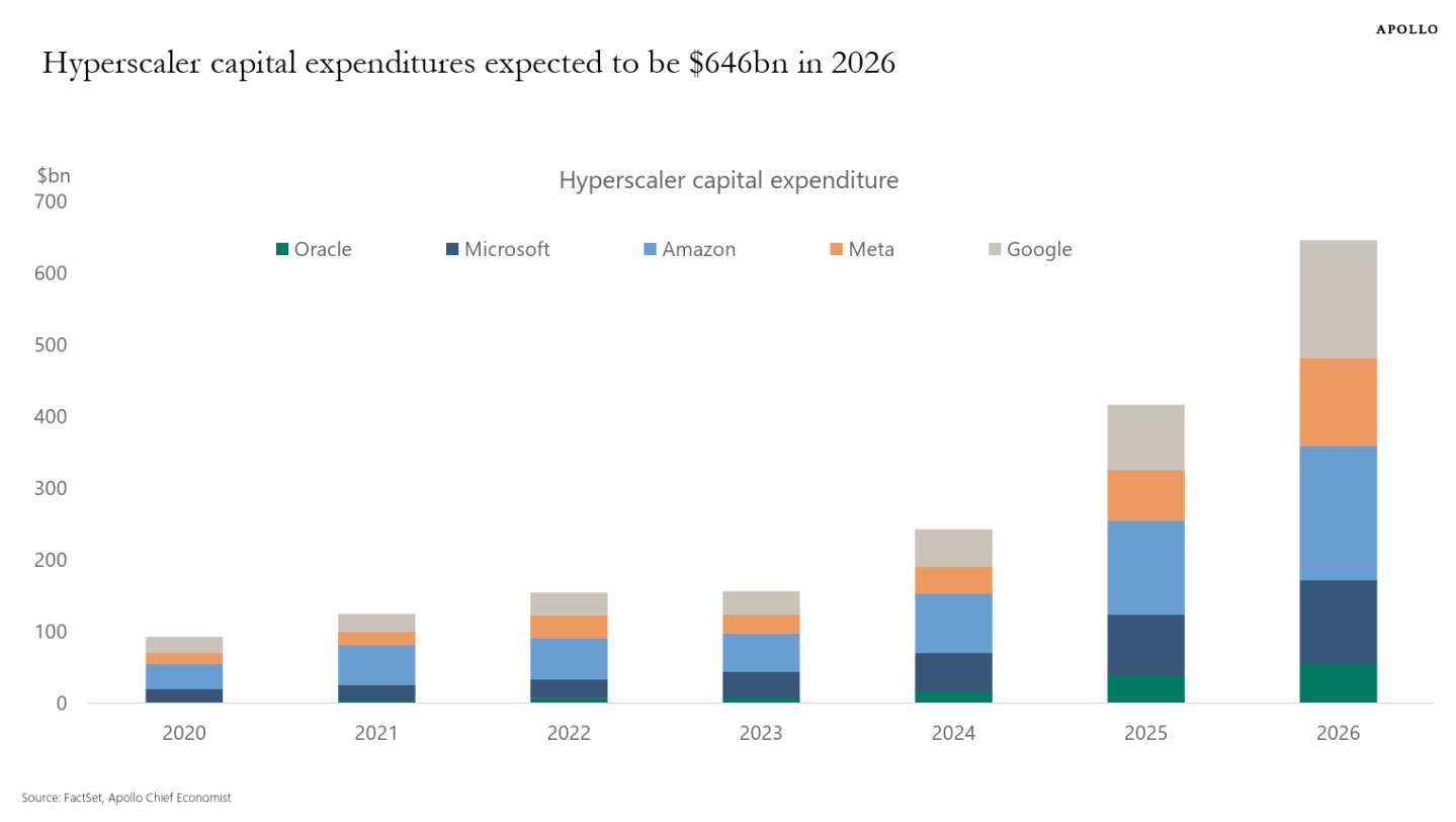 In a chart book published nearly simultaneously with Moody’s report, Apollo Global Management chief economist Torsten Slok worked to put the enormity of data center spending into perspective. With total capital expenditure on data centers estimated at roughly $646 billion, or about 2% of U.S. GDP, Slok noted that is roughly equivalent to the GDP for Singapore, Sweden, and Argentina. Defense spending in 2025, meanwhile, was around $917 billion.