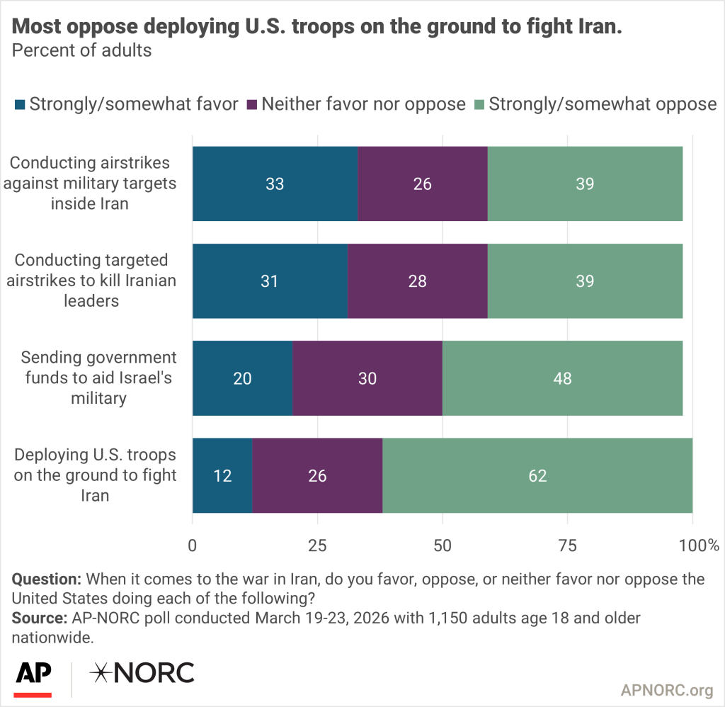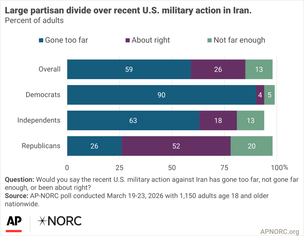 The nationwide poll was conducted March 19-23, 2026 using the AmeriSpeak® Panel, the probability-based panel of NORC at the University of Chicago. Online and telephone interviews using landlines and cell phones were conducted with 1,150 adults. The overall margin of sampling error is +/- 4.0 percentage points.