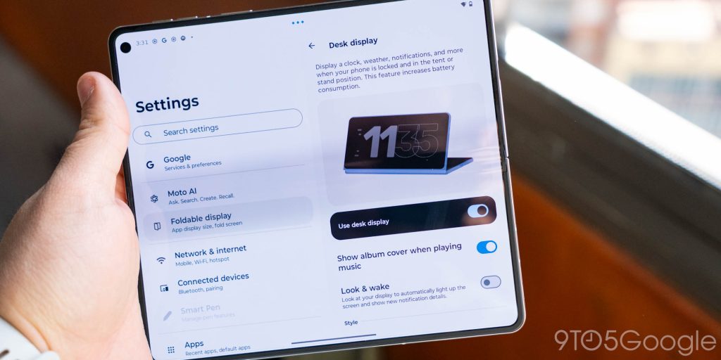 Motorola is also including “desk display” when the device is in a tented mode, with that mode able to show your clock and calendar. This feels very reminescent of Motorola’s tent modes on the Razr series, but I’m not so sure I’d use it on a book-style device.