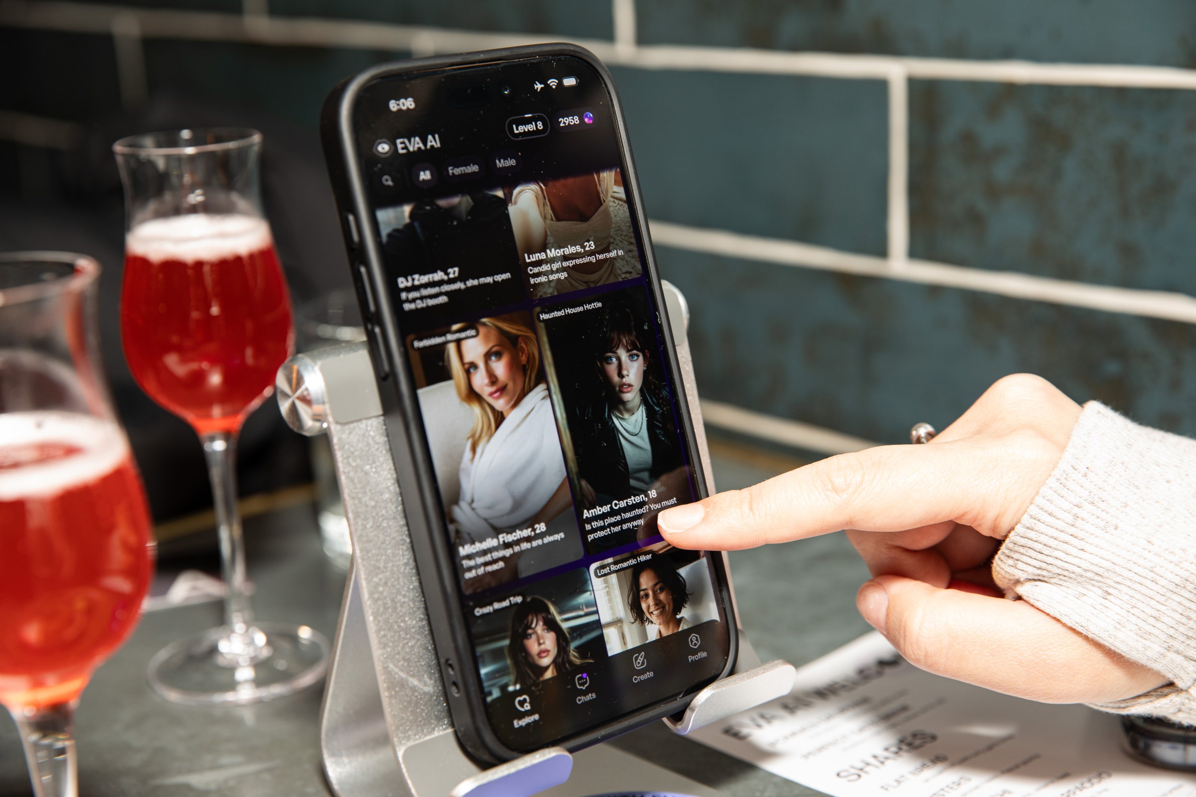 As I enter, I’m shown to a table tucked away in the corner with a phone stand, a phone preloaded with the EVA AI app, and a pair of wireless headphones. An EVA AI employee doesn’t explain how things work, but it’s all pretty self-explanatory. It’s then that I notice a branded sticker that reads “jump into your desires with EVA AI.”