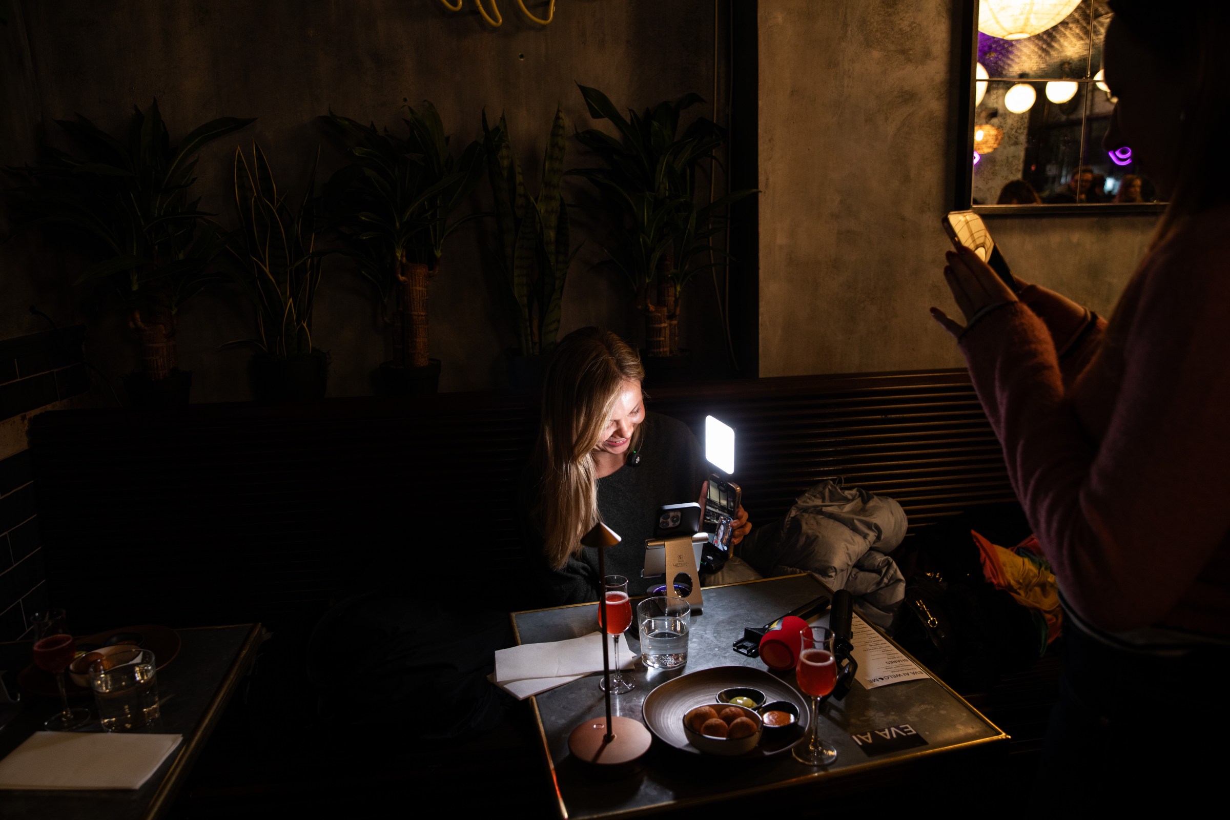 Hopping over a pile of dirty snow, I arrived on a frigid February evening at a wine bar in midtown, a purple neon sign reading “EVA AI cafe.” Inside, several people were seated at tables and booths, staring at phones. Servers milled about, placing mini potato croquettes and nonalcoholic spritzers on each table. Like many New York City bars, the majority of the patrons were on a date.