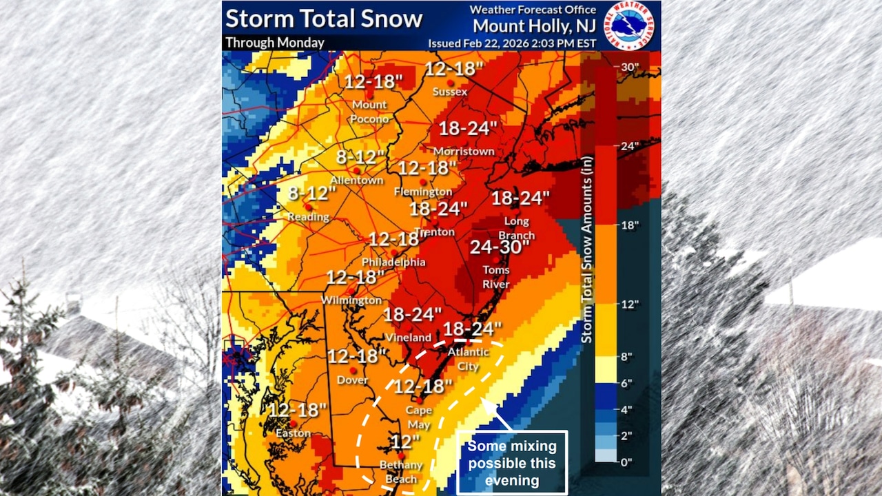 Snow projections have remained at around 2 feet for Monmouth, Ocean and southeastern Burlington counties, which are expected to be the hardest hit.